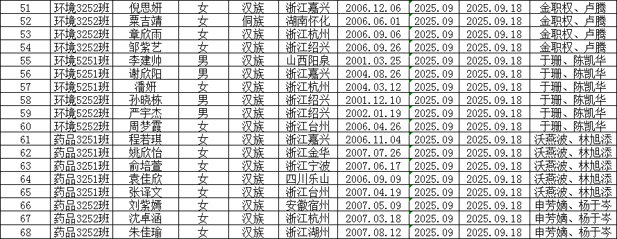通过党员推荐、群团组织推优,经过支部委员会研究,拟将蔡辰杰等68位同志列为入党积极分子,根据发展党员工作有关要求,现将有关情况以表格形式公示如下: